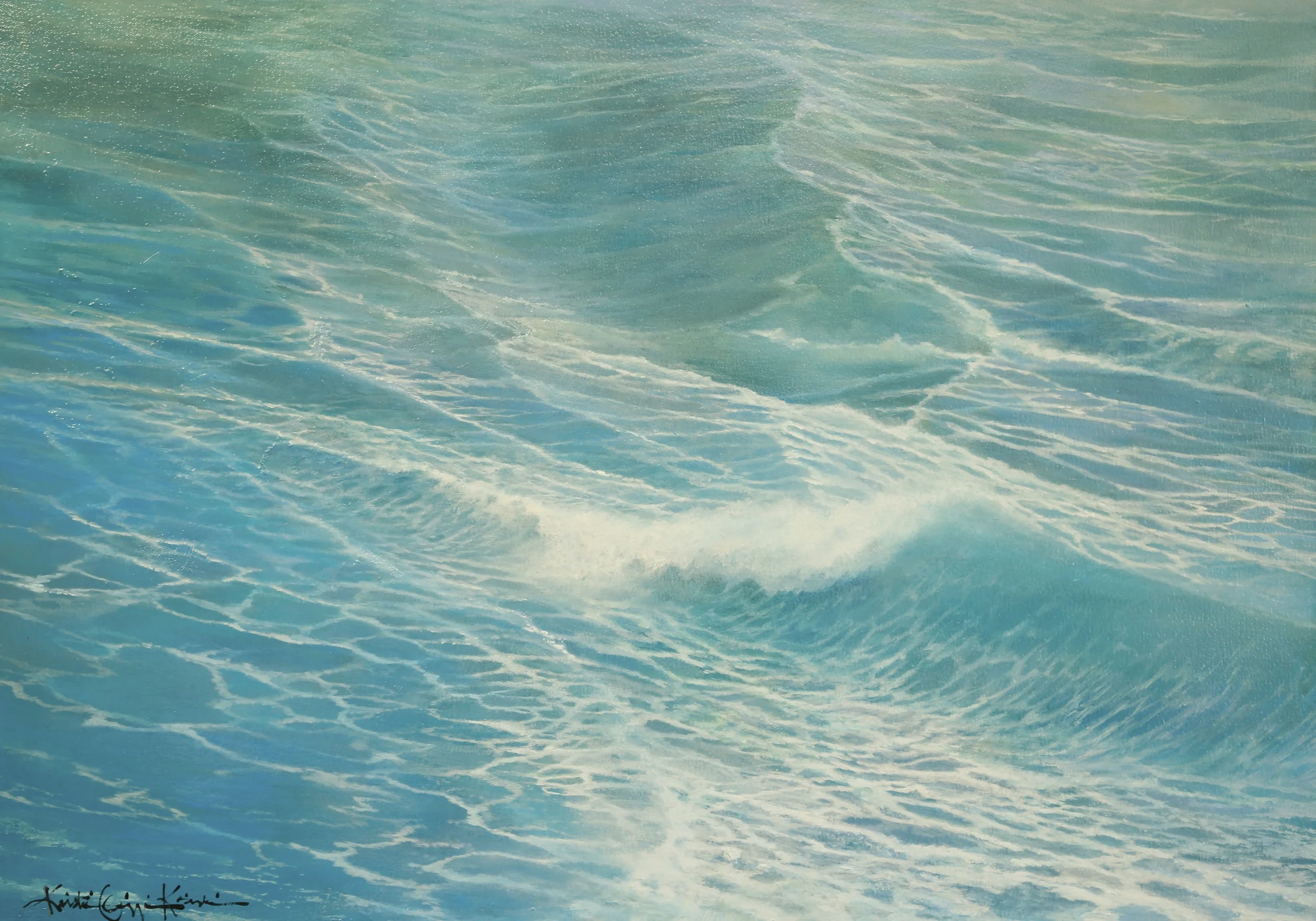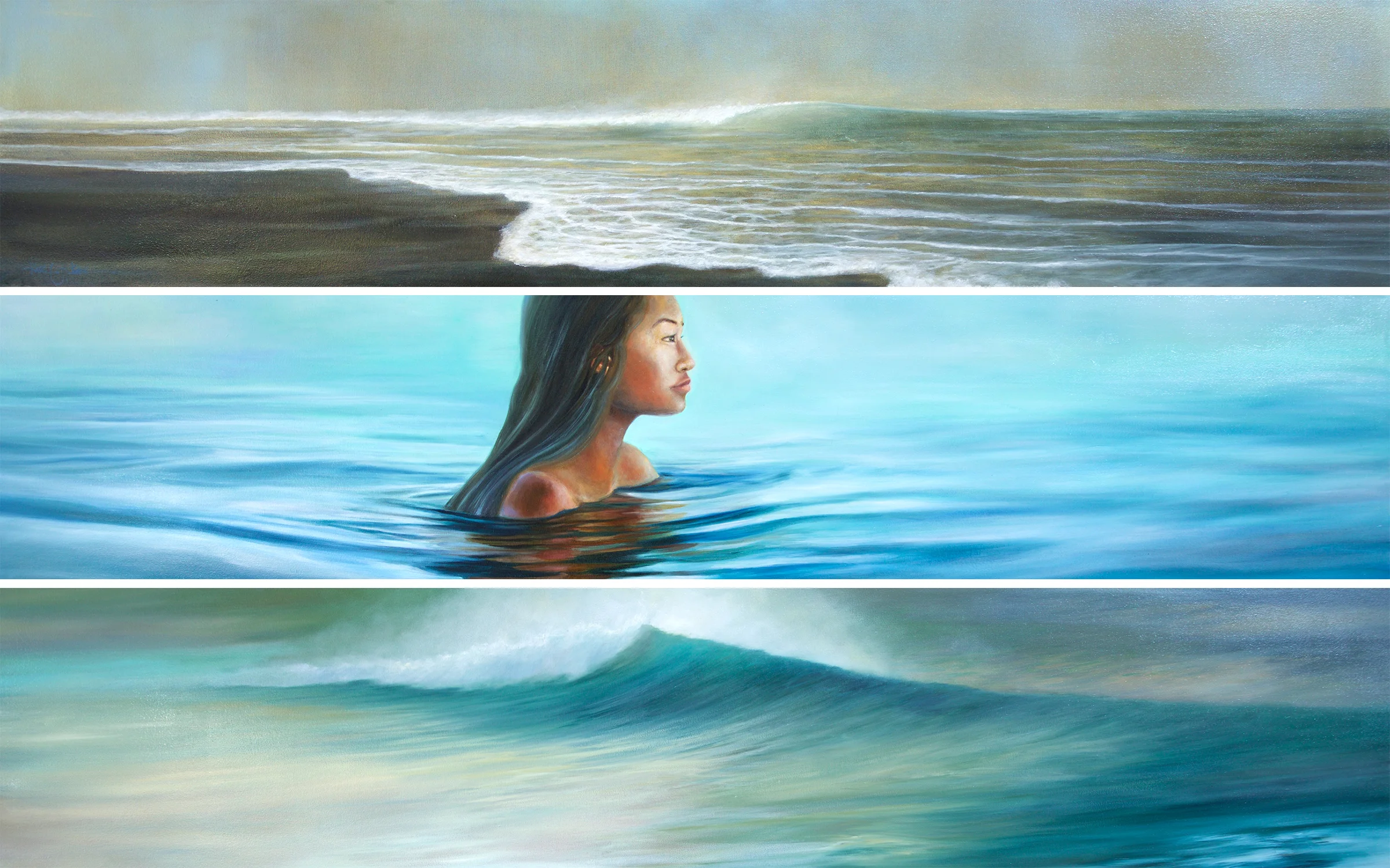 Immersed is a new body of work that has been stirring in my mind for the last few years since moving back home to Hawaii. When I worked on The Lei Maker for the Honolulu International Airport, I created several panels with water and the human figure. It was challenging for me to paint water and the figure but the struggles intrigued me. After I completed the project, I studied with Alyssa Monks in New York who is an inspiring artist that paints in an abstract and realistic style. That experience influences my color palette and my approach to painting.
